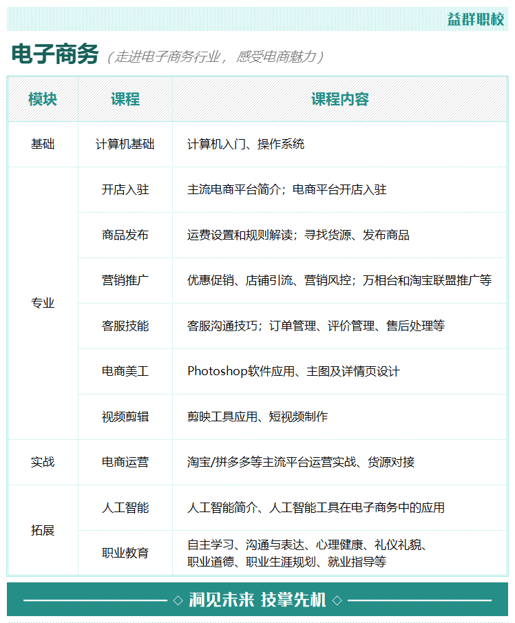 本课程学习计算机基础、电商运营、专业美工等知识及实操技能。全实操教学,快速开店,全面掌握电子商务运营知识。