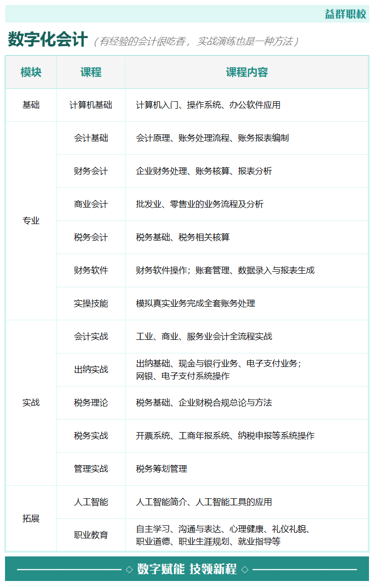 学习计算机基础、会计基础、财务会计、商业会计、手工模拟账实训、财务软件等,以及出纳、财务、税务系统实战实操技能。在掌握会计理论知识及基本实操技能的前提下,增强实践能力。结业可考取初级会计职称,专业培训通过率高。